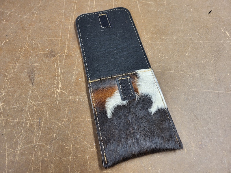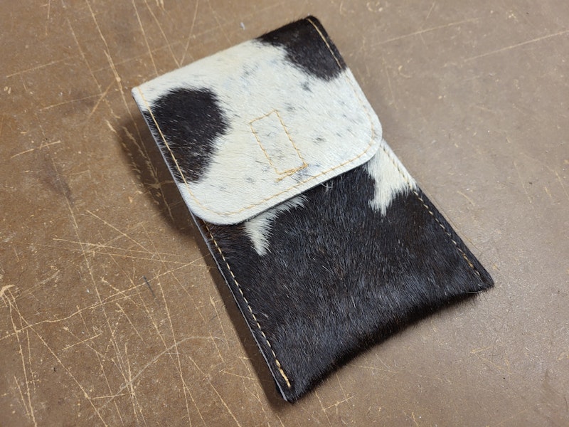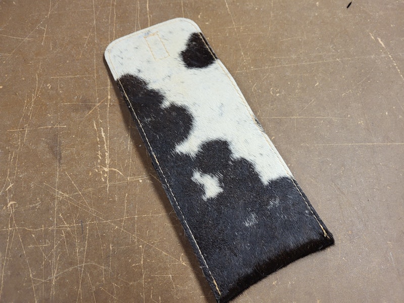 Die Handytasche besteht aus schwarz/weißem Kuhfell.